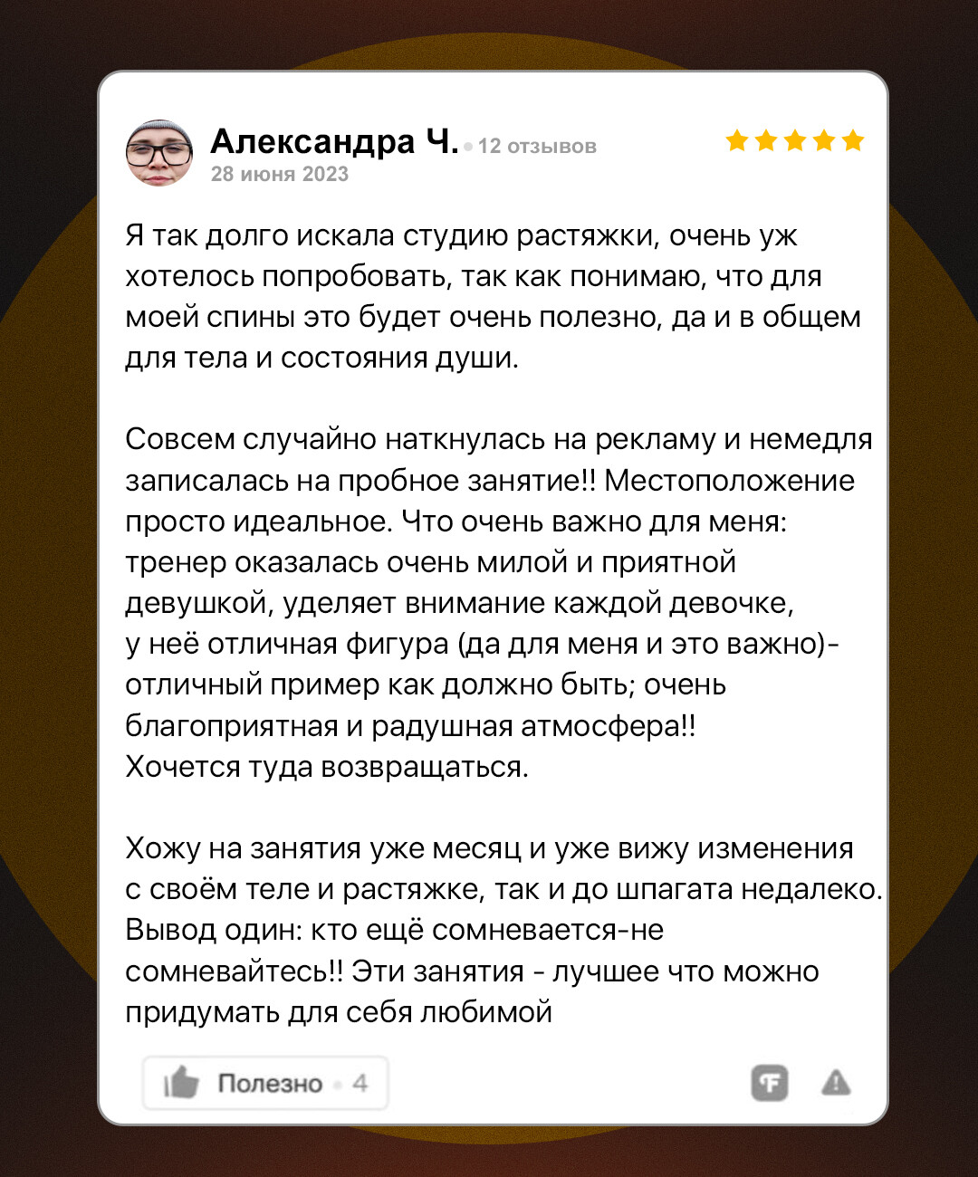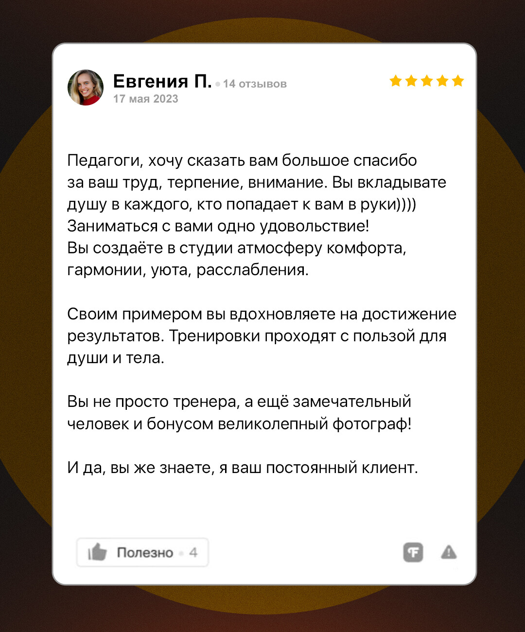 Свое мнение вы сможете сформировать на основе личного опыта. Стоит один раз прийти, чтобы увидеть своими глазами. Ни одна студия не предоставляет такой гибкий график занятий, все тренировки проводятся по специально разработанной авторской методике, разработанной основателем сети.