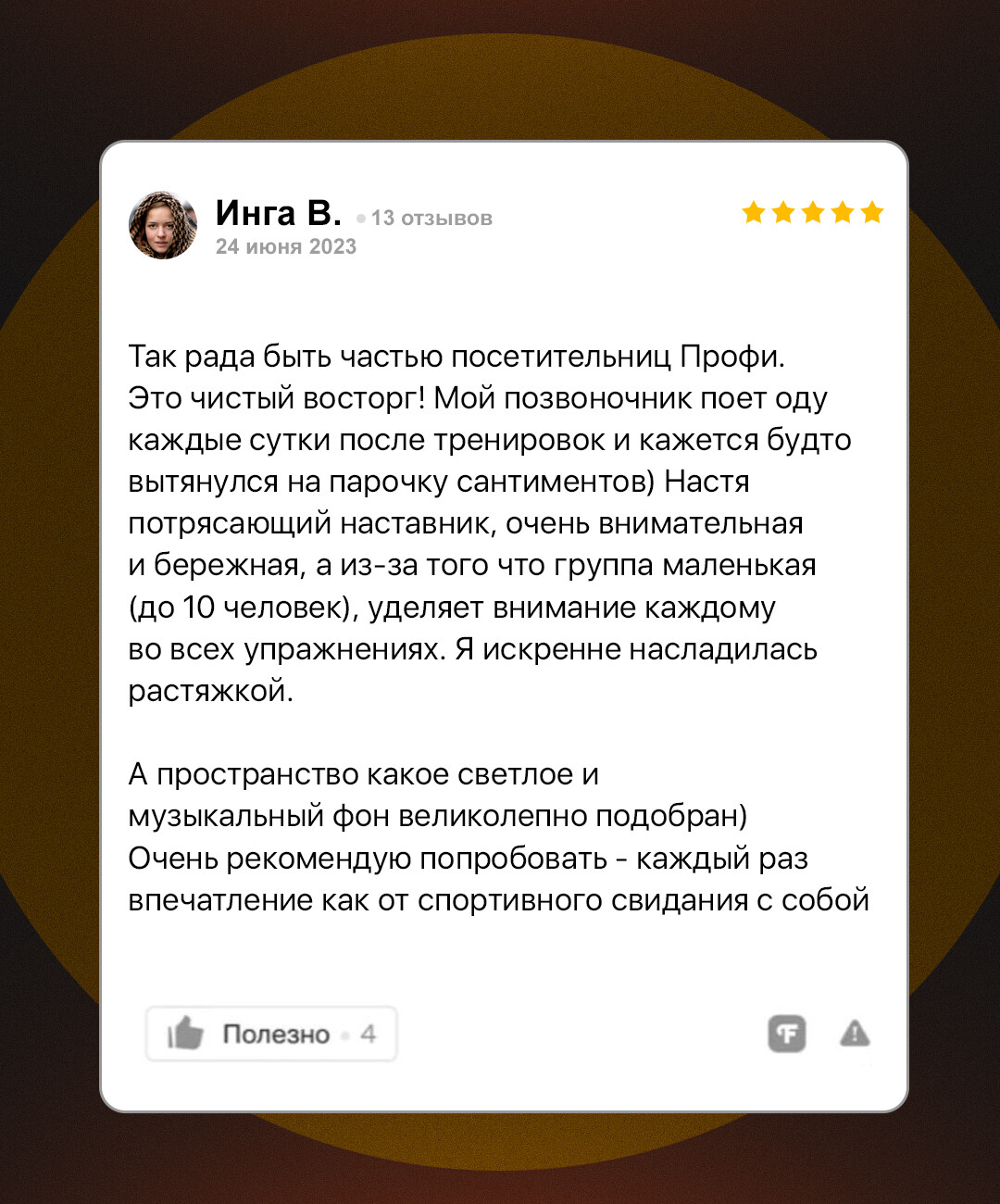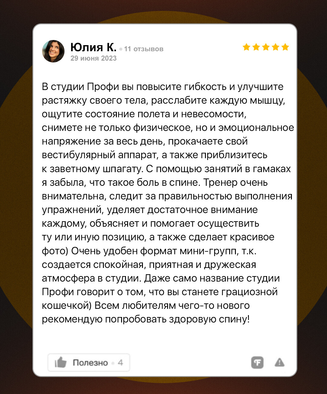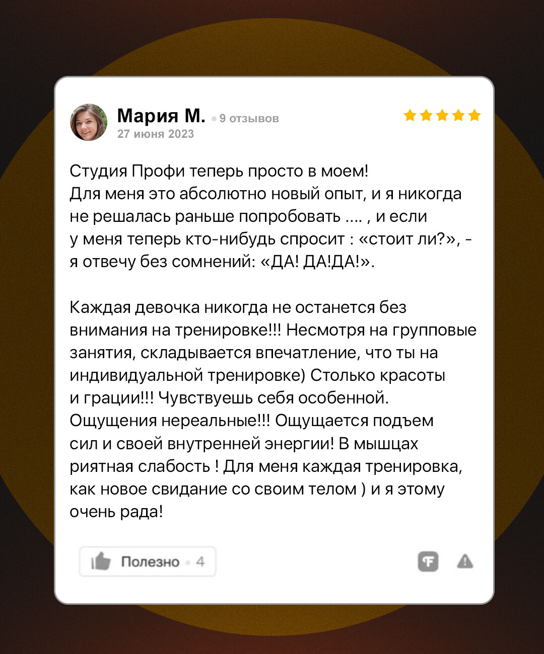 Отзывы о нас вы можете найти в наших соцсетях, на странице ВКонтакте и на картах. У каждой студии в каждом городе есть свои аккаунты. Найти их можно по названию PROFI и с указанием города.