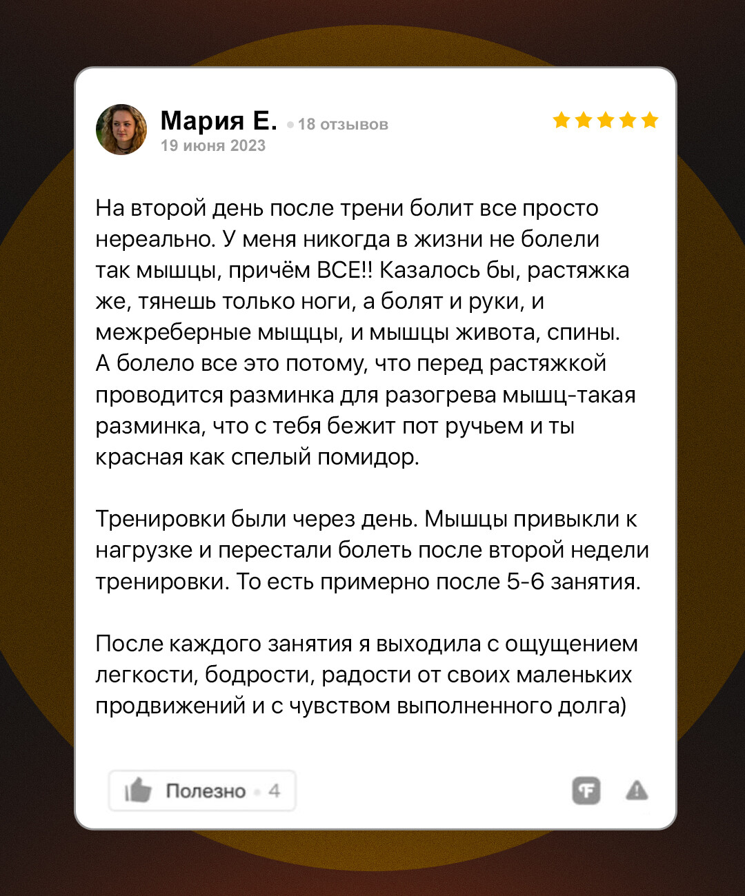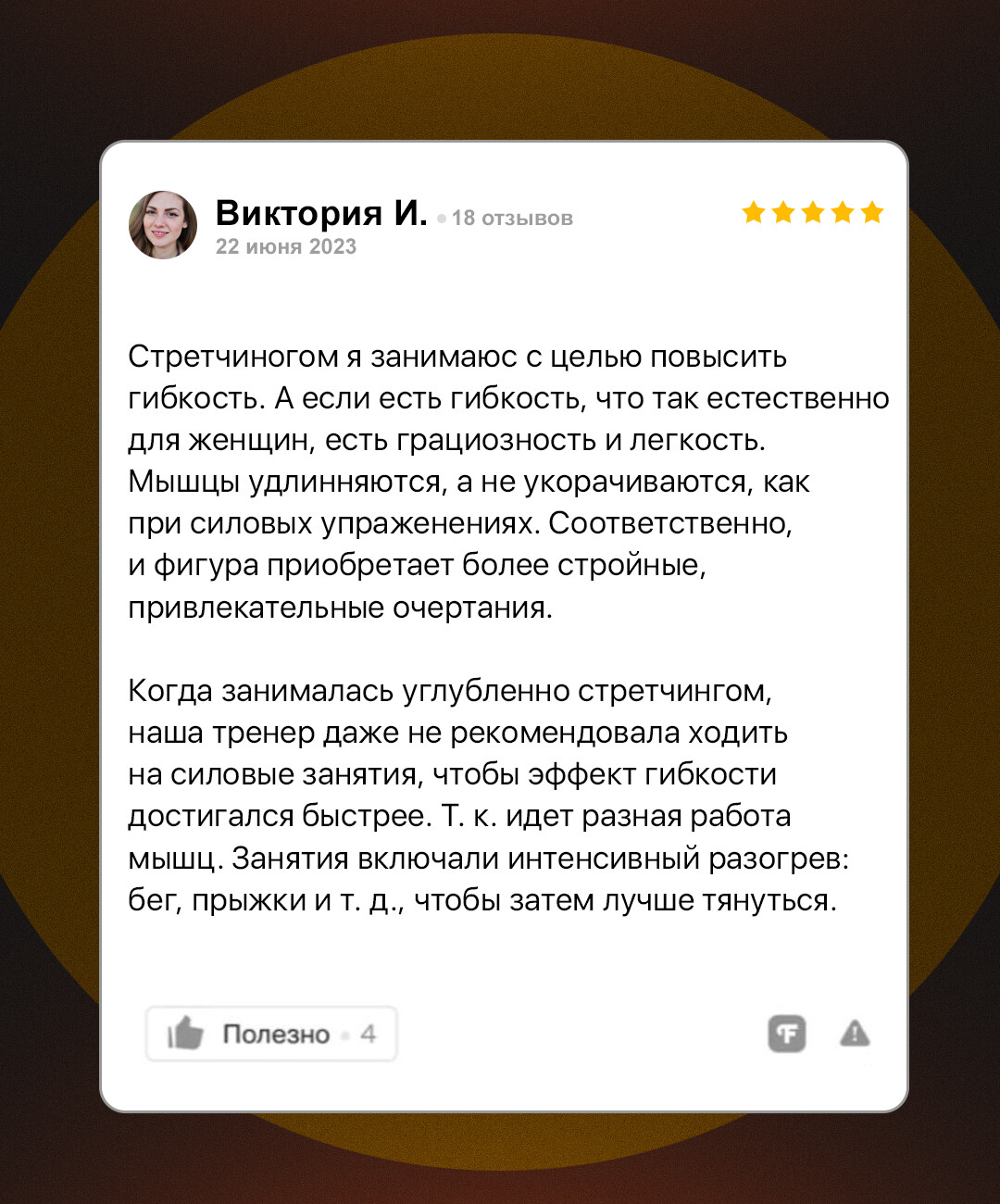 Программа нацелена на общую гибкость, а упражнения охватывают все группы мышц без исключений